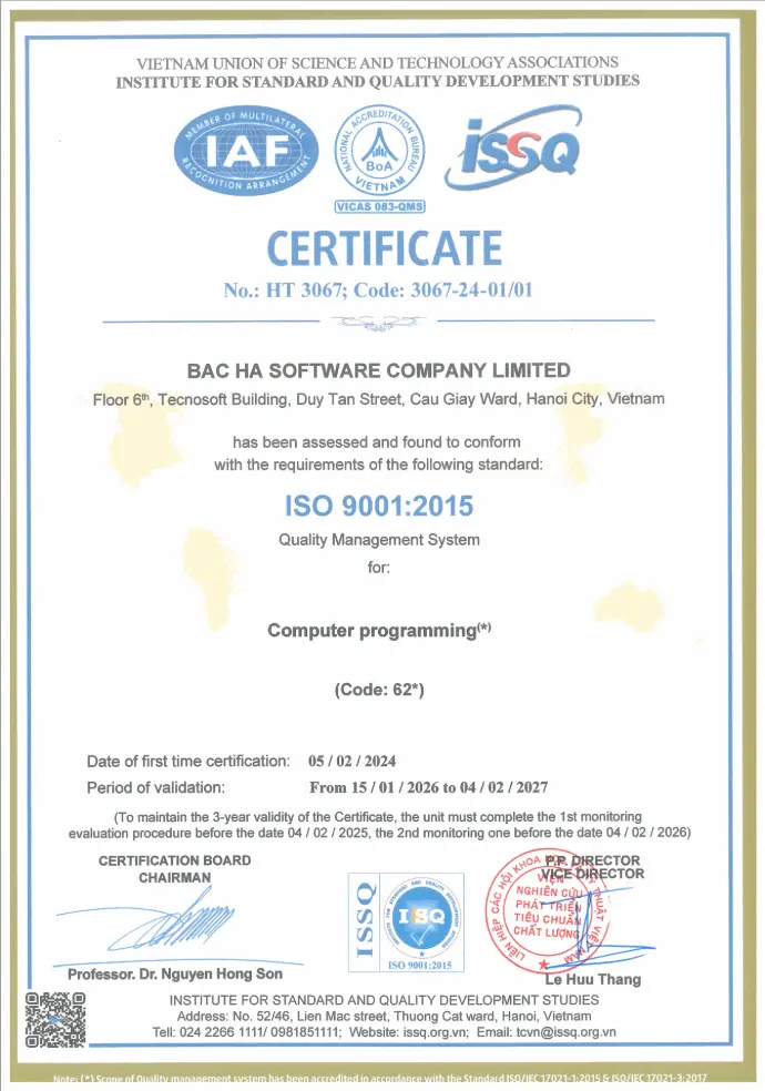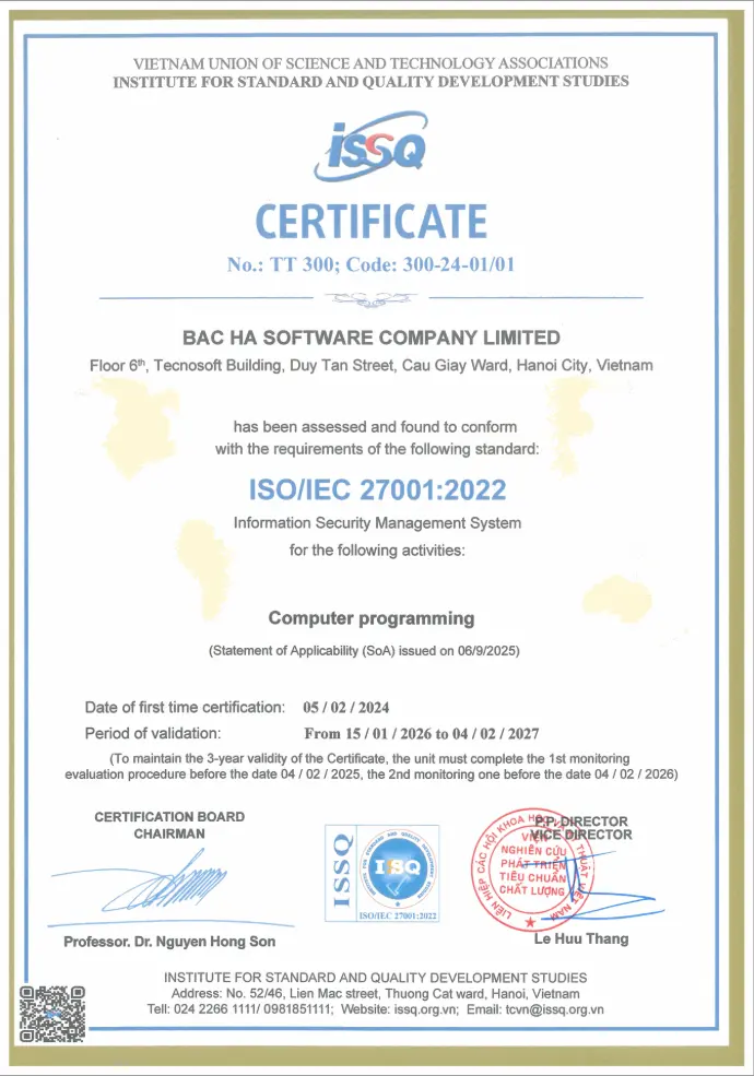 BHSoft proudly achieved ISO/IEC 27001:2013 and ISO 9001:2015 certifications, affirming the company's commitment to excellence in quality and information security standards. These certifications underscore BHSoft's dedication to maintaining high standards for both internal processes and client projects.